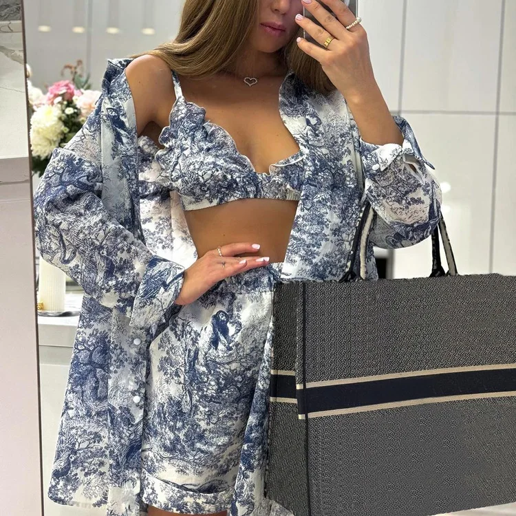 2025 Summer Casual Long Sleeve Button Print Fashion Shirt with Shorts Suit Women's Retro Ink Shirt Three-piece Shorts Suit